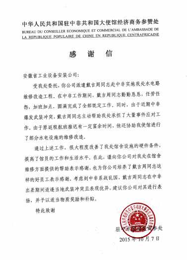 中華人民共和國(guó)駐中非共和國(guó)大使館經(jīng)濟(jì)商務(wù)參贊處向公司發(fā)來(lái)感謝信