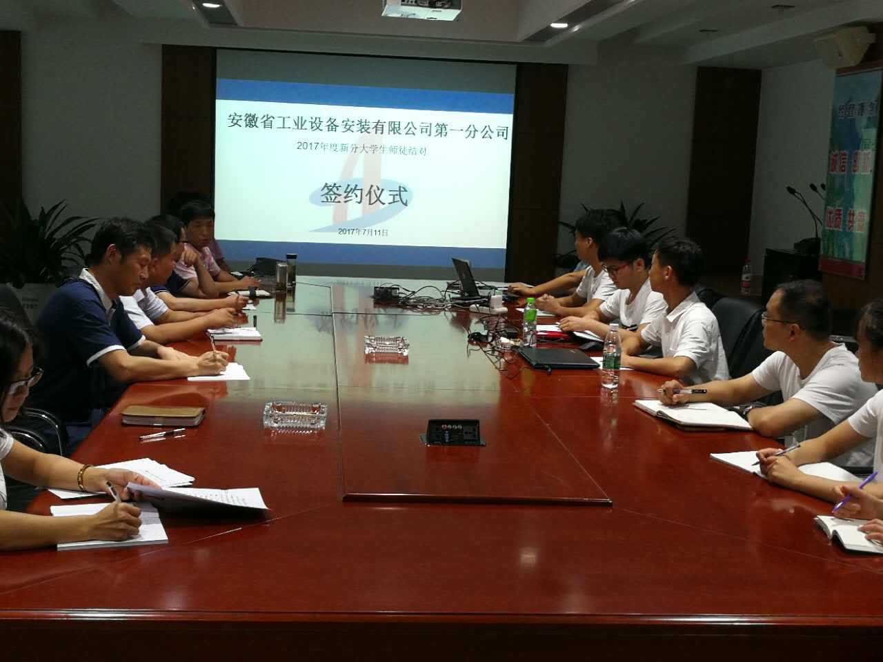 第一分公司2017年新入職員工已完成輪崗實(shí)習(xí)培訓(xùn),即將步入定崗實(shí)習(xí)階段。為了充分發(fā)揮技術(shù)骨干人才的“傳、幫、帶”作用,加強(qiáng)對(duì)新人的技術(shù)、技能培養(yǎng),7月11日下午,一分公司舉行了師徒協(xié)議簽訂儀式。