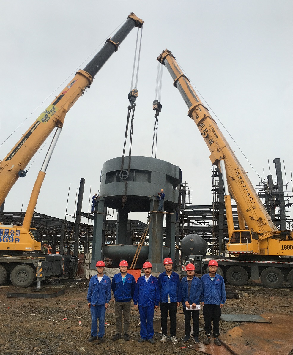 本次吊裝的反應(yīng)器中段部分重達(dá)220噸,分公司領(lǐng)導(dǎo)高度重視,吊裝前期,邀請(qǐng)公司總工吳繼成、總工辦主任牛守義和安全部王岳濤經(jīng)理親臨項(xiàng)目部參與設(shè)備吊裝的專題方案討論定稿工作。當(dāng)日上午,吊裝現(xiàn)場(chǎng)準(zhǔn)備工作緊張卻又有條不紊的進(jìn)行,項(xiàng)目經(jīng)理李子鳳向全體“參戰(zhàn)”員工進(jìn)行了安全交底,工作人員對(duì)兩臺(tái)分別為500T、350T吊車(chē)的站位及性能再次確認(rèn),現(xiàn)場(chǎng)機(jī)具、人員均按既定方案實(shí)施。分公司經(jīng)理史崇松、業(yè)主單位負(fù)責(zé)人、監(jiān)理全程在現(xiàn)場(chǎng)“督戰(zhàn)”,全體工作人員經(jīng)過(guò)四個(gè)小時(shí)的奮戰(zhàn),吊裝作業(yè)圓滿結(jié)束。