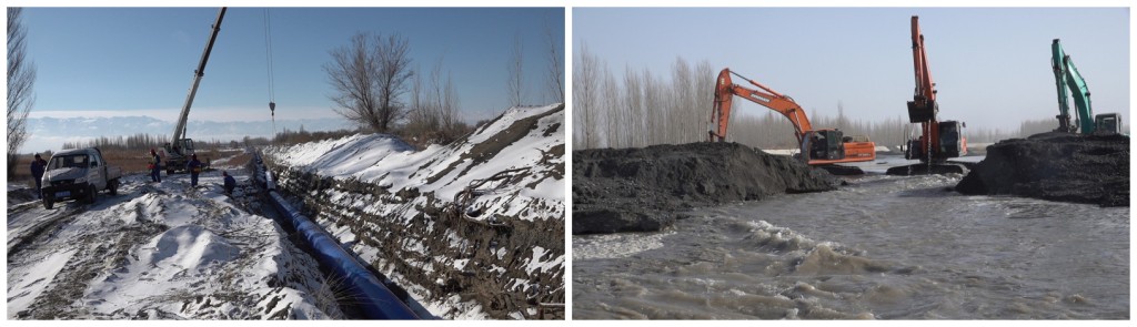 由于施工工期短,為了按時(shí)完成管道穿引洪渠任務(wù),目前,在項(xiàng)目執(zhí)行經(jīng)理柴琳、項(xiàng)目副經(jīng)理張寶深以及項(xiàng)目技術(shù)負(fù)責(zé)人蔡京利的帶領(lǐng)下,項(xiàng)目部正在堅(jiān)持24小時(shí)不間斷施工;除此之外,由于施工現(xiàn)場(chǎng)“戰(zhàn)線長(zhǎng)”,距離附近集鎮(zhèn)和項(xiàng)目部基地都較遠(yuǎn),項(xiàng)目部在河渠邊搭建兩個(gè)軍用帳篷做為施工指揮部,“冷饃硬馕加泡面”成了項(xiàng)目部午餐“標(biāo)配”。施工間歇,施工人員就在管溝邊用撿到的枯木點(diǎn)燃火堆取暖。在穿越四棵樹(shù)河施工段施工過(guò)程中,管溝挖深總共約4米,但管溝中的水深卻高達(dá)3米,由于管道安裝滿足標(biāo)高要求,即使面臨開(kāi)挖出水多,施工難度大的困境,項(xiàng)目副經(jīng)理馬讓同志依舊毫不猶豫地召集起項(xiàng)目上的黨員同志,帶頭穿上雨衣皮褲,站在挖機(jī)斗中下河扶塔尺測(cè)標(biāo)高,保證管道安裝質(zhì)量。他們的身影深深地感染著項(xiàng)目上的每一個(gè)人。在四棵樹(shù)河中管道施工時(shí),需要將上游河水截流,時(shí)間緊任務(wù)重,項(xiàng)目全體員工不喊累不叫苦,沒(méi)日沒(méi)夜加班奮戰(zhàn),搶抓施工進(jìn)度......