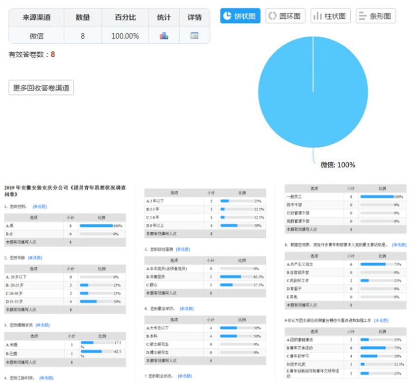 隨后,為進(jìn)一步深入了解青年員工思想、工作、生活狀況,根據(jù)新時(shí)期青年思想特點(diǎn),結(jié)合分公司實(shí)際情況,團(tuán)支部利用手機(jī)微信掃碼方式在會(huì)議現(xiàn)場(chǎng)對(duì)每位青年員工進(jìn)行了思想狀況調(diào)查。團(tuán)支部將根據(jù)統(tǒng)計(jì)分析報(bào)告,針對(duì)大家所需所想,廣泛開展形式多樣、內(nèi)容豐富的集體活動(dòng)。