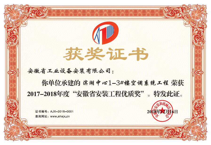 根據(jù)《中國安裝工程優(yōu)質(zhì)獎(中國安裝之星)評選辦法》(安協(xié)〔2015〕19號)、《關(guān)于開展“2017-2018 年度中國安裝工程優(yōu)質(zhì)獎(中國安裝之星)第一批評選活動”的通知》(安協(xié)〔2017〕7 號)要求,協(xié)會做為我省推薦單位,組織專家對七個申報中國安裝工程優(yōu)質(zhì)獎項目,進行檢查驗收,一致認為,均代表我省安裝行業(yè)優(yōu)質(zhì)水平。為表彰先進,樹立標桿,經(jīng)研究決定授予安徽省工業(yè)設(shè)備安裝有限公司“濱湖中心1-3#樓空調(diào)系統(tǒng)工程”等七項工程榮獲2017-2018年度“安徽省安裝工程優(yōu)質(zhì)獎”。并在協(xié)會第七屆三次理事(擴大)會議上通報表彰。協(xié)會希望各獲獎單位珍惜榮譽,再接再厲,繼續(xù)探索爭先創(chuàng)優(yōu)的經(jīng)驗,充分發(fā)揮示范引領(lǐng)作用,各協(xié)會會員單位要以獲獎單位為榜樣,牢固樹立質(zhì)量第一意識,多出精品,多創(chuàng)名品,為質(zhì)量強省,提質(zhì)優(yōu)效,轉(zhuǎn)型升級發(fā)展而努力。