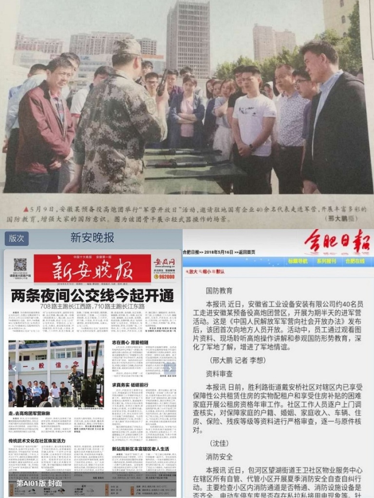 自5月9日安徽安裝公司組織開展赴安徽預備役師高炮團營區(qū)開展“走進軍營·感受軍魂”愛國主義教育實踐活動以來,合肥日報、新安晚報、人民陸軍報等多家媒體對此活動進行了報道。
