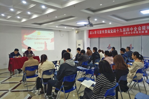 為深入學(xué)習(xí)宣傳貫徹黨的十九屆四中全會(huì)精神,打牢政治基礎(chǔ),堅(jiān)定政治方向,11月13日下午3點(diǎn),合肥分公司黨支部在公司十五樓職工之家組織召開(kāi)黨的十九屆四中全會(huì)精神學(xué)習(xí)專題會(huì),分公司領(lǐng)導(dǎo)班子成員、機(jī)關(guān)全體黨員干部及在肥項(xiàng)目部人員參加了會(huì)議,會(huì)議由黨支部書記胡迎東主持。