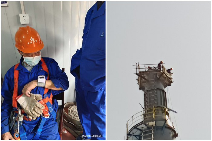 面對(duì)Ⅲ級(jí)高空作業(yè),項(xiàng)目部從對(duì)登塔作業(yè)人員的篩選開(kāi)始就不敢有半點(diǎn)大意,除了項(xiàng)目技術(shù)負(fù)責(zé)人、安全負(fù)責(zé)人分別進(jìn)行技術(shù)和安全交底外,還仔細(xì)檢查了登塔人員體檢報(bào)告,并在登塔作業(yè)前逐一對(duì)其進(jìn)行血壓測(cè)量,確保高處作業(yè)人員身體狀況穩(wěn)定。同時(shí),配備對(duì)講機(jī),保障上下作業(yè)人員密切配合,順利吊裝,還要對(duì)作業(yè)平臺(tái)和周圍區(qū)域滿鋪防火布,設(shè)置接火盆,避免塔體下方易燃易爆風(fēng)險(xiǎn),以此杜微慎防,確保萬(wàn)無(wú)一失。11時(shí)28分,脫硫塔上段吊裝正式開(kāi)始。在場(chǎng)人員個(gè)個(gè)屏息凝神,目光隨著脫硫塔一起移動(dòng),思緒跟著脫硫塔一起飆高,“慢慢的...升一點(diǎn)...往西偏一點(diǎn)點(diǎn)...好!停!...降,慢一點(diǎn)...降降降,好!”終于完成上段吊裝環(huán)節(jié)作業(yè),所有人懸著的心都放下來(lái)了,但是任務(wù)還沒(méi)徹底完成,接下來(lái)就是更重要的對(duì)口、焊接環(huán)節(jié)。由于要進(jìn)入塔內(nèi)進(jìn)行對(duì)口焊接,為了保障作業(yè)人員的生命安全,配備氣體檢測(cè)儀,以測(cè)量塔內(nèi)氧氣濃度是否正常,無(wú)硫化氫和可燃性氣體是否超標(biāo)。