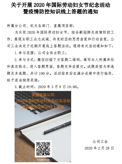 鑒于當(dāng)前新冠肺炎疫情防控特殊時期,本著不聚集、少聚集的原則,安徽安裝公司工會組織全公司八十多名女職工參加了疫情防控和《婦女權(quán)益保障法》等知識的學(xué)習(xí),利用微信平臺開展了線上答題活動,活動一推出,廣大女職工立即響應(yīng),熱情高漲,對于不太清楚的問題,主動查閱相關(guān)資料,與身邊的同事討論,對模棱兩可的問題,仔細(xì)斟酌精確作答。通過此次答題活動,全公司范圍內(nèi)再一次掀起宣傳疫情防控常識的熱潮,推動公司疫情防控工作的開展,也進(jìn)一步普及了新時期下女職工的合法權(quán)益。答題活動結(jié)束后,對優(yōu)秀成績給予獎勵。