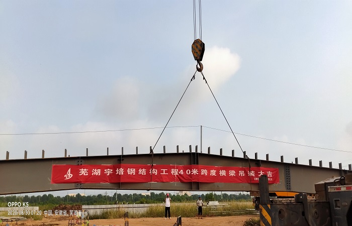 蕪湖宇培鋼結構項目露天跨部分為現(xiàn)場整體廠房連接點,同時也是連接PC1/PC2兩個廠房大跨度橫梁結構核心區(qū),包括21拼大跨度橫梁,此橫梁為蕪湖宇培項目鋼結構工程中重量最大的鋼構件,長度約為40米,最大寬度達1.5米,重量約10噸。露天跨部分的吊裝作業(yè),是本項目難度最大,精度要求最高的一項工程,特別是吊裝完善后橫梁與PC2號廠房的連接點采用高強螺栓連接,而另一端與PC1號廠房采用焊接擋板滾軸式連接,每跨橫梁在后期達到可以移動的效果。