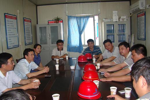 張書記一行代表集團(tuán)公司向堅(jiān)守崗位的職工表示親切慰問,并認(rèn)真聽取了項(xiàng)目部經(jīng)理郭左明有關(guān)工程概況、項(xiàng)目安全生產(chǎn)與保護(hù)、開展“雙爭(zhēng)”勞動(dòng)競(jìng)賽、“黨員先鋒號(hào)”活動(dòng)和創(chuàng)文明示范工地等工作匯報(bào)。張書記強(qiáng)調(diào):項(xiàng)目部要密切關(guān)注高溫期間職工的生產(chǎn)、生活情況,要特別重視安全生產(chǎn),扎實(shí)地做好各項(xiàng)基礎(chǔ)工作,保質(zhì)保量完成工作任務(wù),樹立安徽省安的品牌形象。王總代表公司向集團(tuán)領(lǐng)導(dǎo)冒著酷暑親臨一線慰問表示衷心的感謝,并表示:全體省安人將繼續(xù)發(fā)揚(yáng)“特別能吃苦、特別能戰(zhàn)斗”的精神,戰(zhàn)勝酷暑,奮力攻堅(jiān),保證各項(xiàng)任務(wù)順利完成。