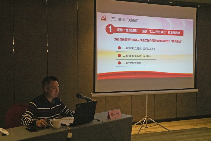 胡六中在報(bào)告中帶領(lǐng)大家共同回顧了習(xí)近平總書記考察安徽行程路線和重要講話精神,他指出,總書記在考察中多次提到“要牢固樹立以人民為中心的發(fā)展思想”“要踐行黨的宗旨,樹牢群眾觀點(diǎn)”“要多謀民生之利、多解民生之憂”,全體黨員領(lǐng)導(dǎo)干部一要從改進(jìn)工作作風(fēng)開始用行動(dòng)踐行“群眾路線”,落實(shí)“以人民為中心”的發(fā)展思想;二要堅(jiān)持“黨管干部”,全面深化干部制度改革;三要堅(jiān)持“一體化”和“高質(zhì)量”,推動(dòng)黨建與生產(chǎn)經(jīng)營(yíng)深度融合。