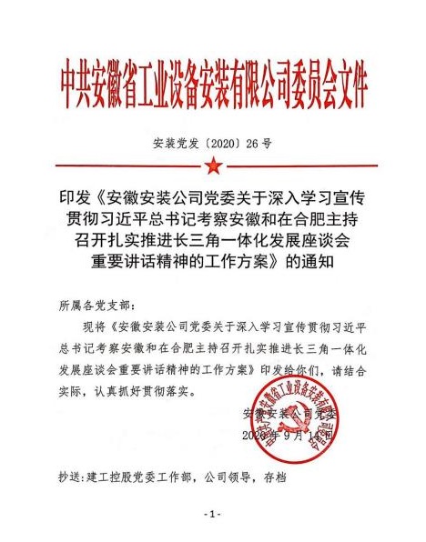 一是公司黨委迅速嚴(yán)密部署學(xué)習(xí)宣傳貫徹各項(xiàng)工作。9月8日,公司黨委理論中心組率先帶頭,認(rèn)真學(xué)習(xí)重要講話精神,深刻交流研討。9月14日,安徽安裝公司黨委下發(fā)《關(guān)于深入學(xué)習(xí)宣傳貫徹習(xí)近平總書記考察安徽和在合肥主持召開扎實(shí)推進(jìn)長三角一體化發(fā)展座談會(huì)重要講話精神的工作方案》,結(jié)合公司實(shí)際,精心嚴(yán)密部署“大學(xué)習(xí)”“大宣傳”“大貫徹”和“大落實(shí)”工作,確保公司上下人人都學(xué)習(xí),人人都領(lǐng)會(huì)。