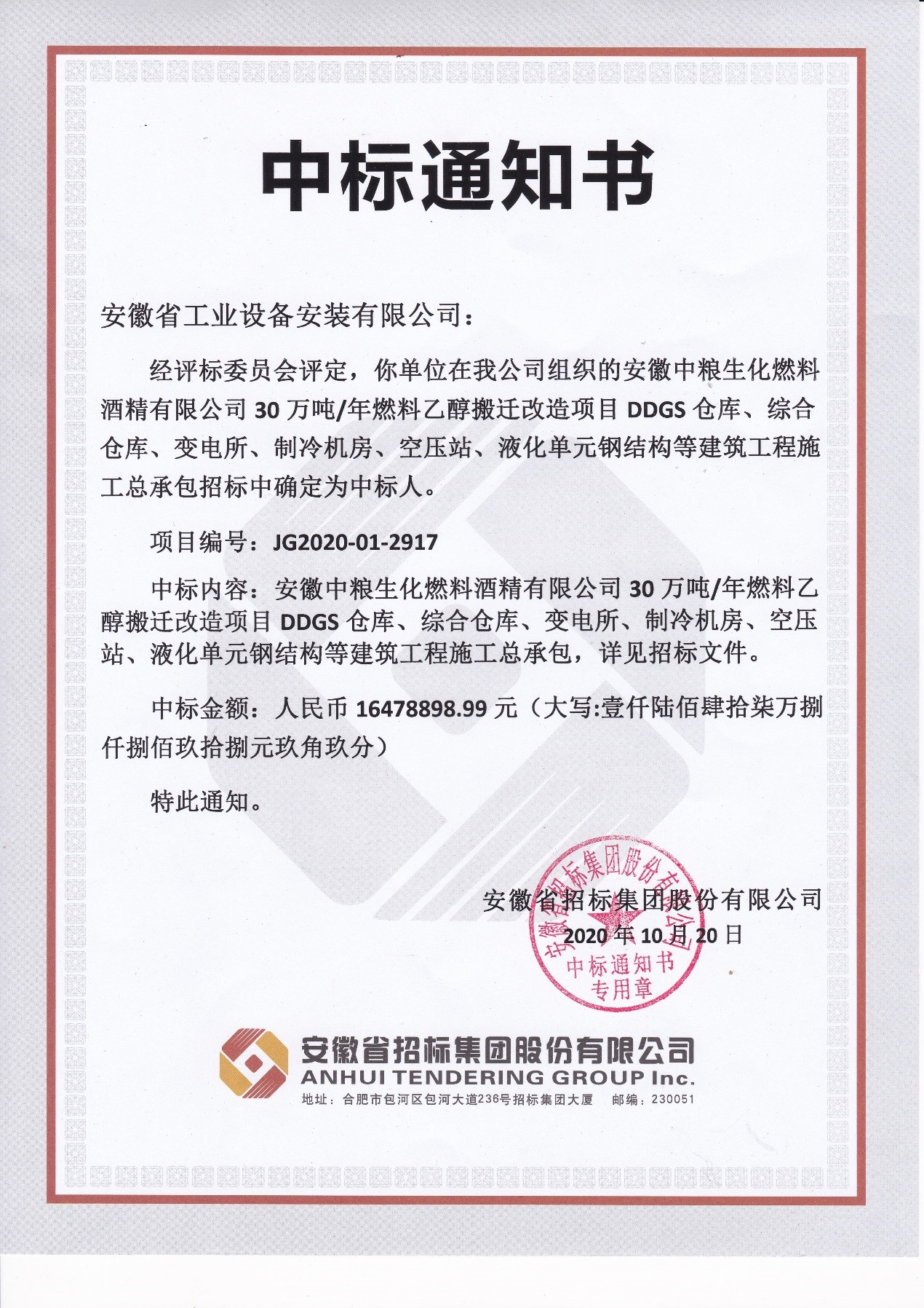 近日,蚌埠分公司經(jīng)過激烈競(jìng)標(biāo),成功中標(biāo)安徽中糧生化燃料酒精有限公司30萬噸/年燃料乙醇搬遷改造項(xiàng)目DDGS倉庫、綜合倉庫、變電所、制冷機(jī)房、空壓站、液化單元鋼結(jié)構(gòu)等建筑工程施工總承包項(xiàng)目,中標(biāo)金額:1647.89萬元。過硬的資質(zhì)、雄厚的技術(shù)實(shí)力、合理的價(jià)格、誠實(shí)守信的經(jīng)營方式、完善的服務(wù)體系是我們勝出的理由。