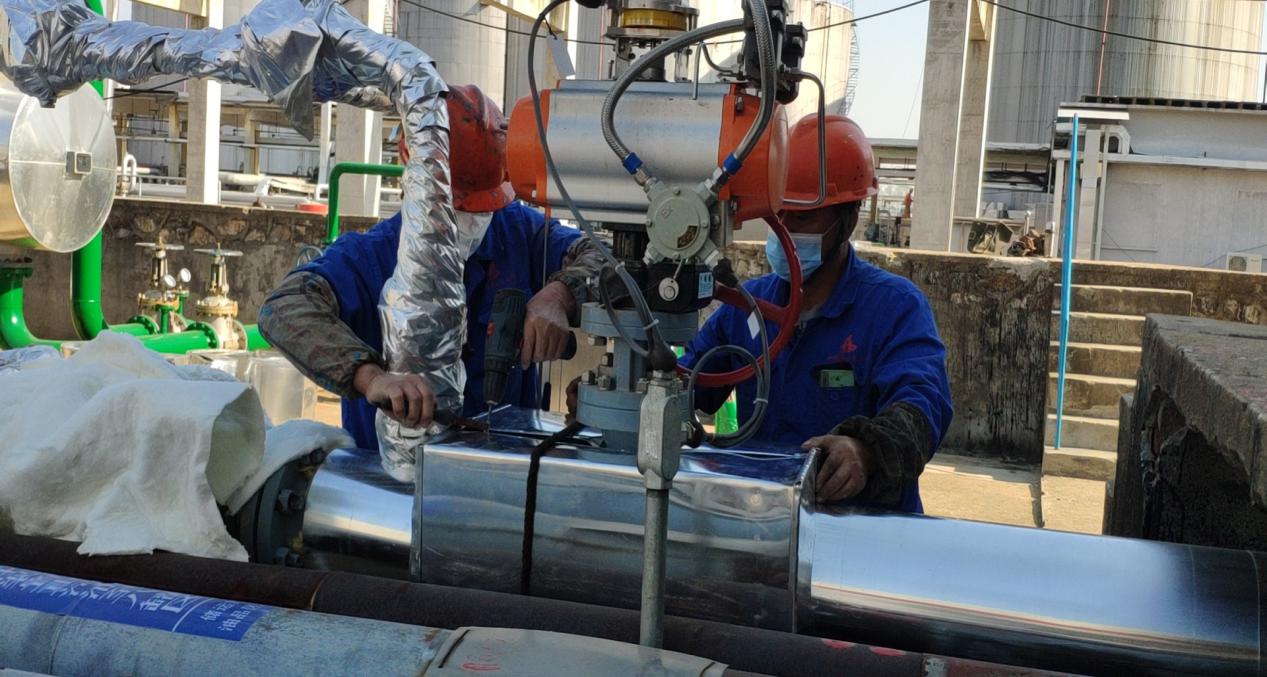 在安慶石化重污油罐尾氣治理項目上,工人們正在進行管道保溫施工工作。分段管道的保溫施工按照不同吊裝地點合適程度而定,目前采用地面管道保溫施工,完成后留出焊縫及吊點位置,待吊裝后再及時進行焊縫及吊點保溫施工工作。