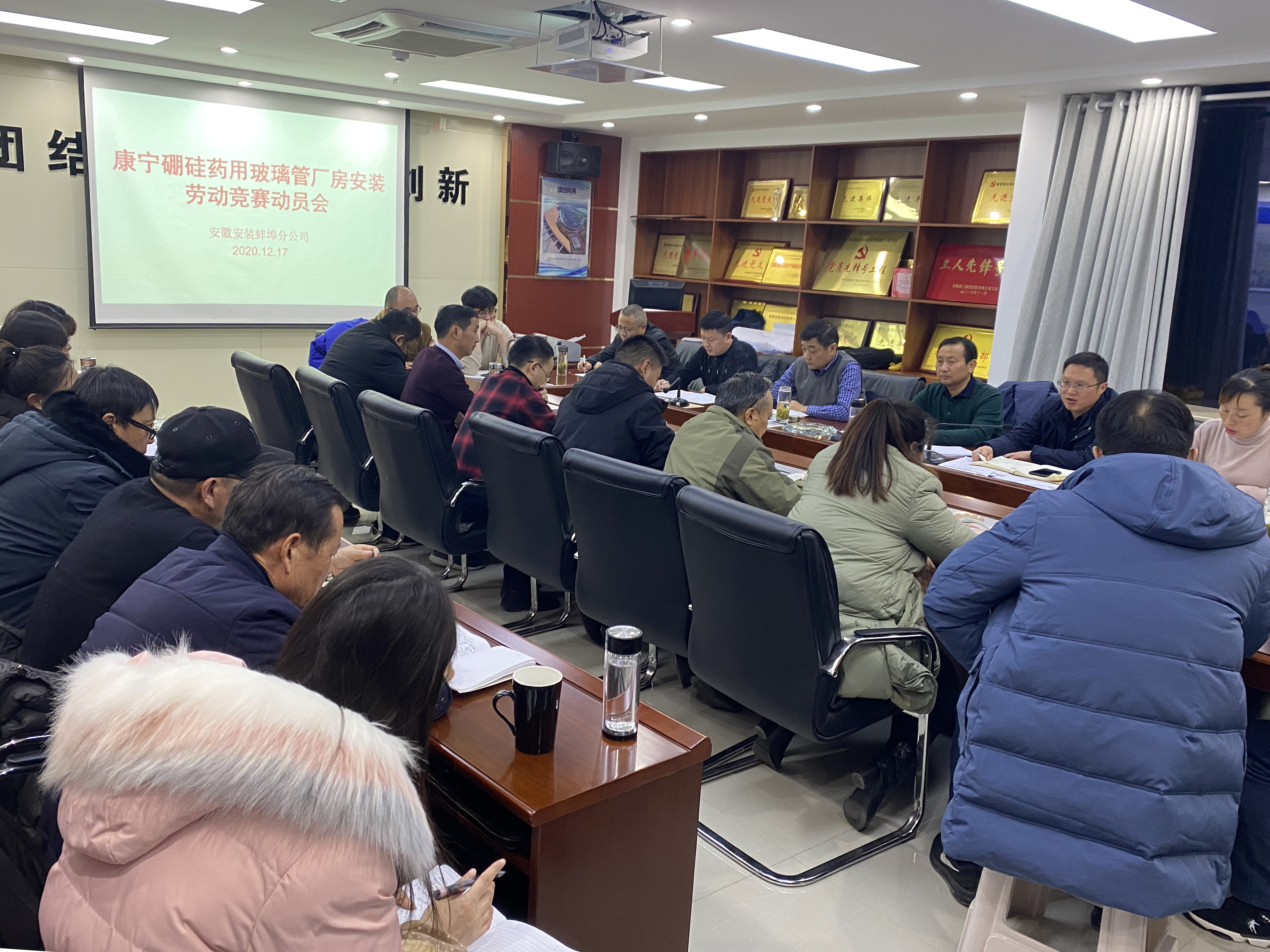 為加快推動(dòng)康寧硼硅醫(yī)用玻璃項(xiàng)目全面快速達(dá)產(chǎn),充分調(diào)動(dòng)員工工作的主動(dòng)性和積極性,貫徹落實(shí)集團(tuán)公司“戰(zhàn)疫情、搶工期、保目標(biāo)、促超產(chǎn)”為主題的勞動(dòng)競(jìng)賽活動(dòng)精神,12月17日晚,蚌埠分公司召開康寧項(xiàng)目“大干100天,決戰(zhàn)3.31”的勞動(dòng)競(jìng)賽動(dòng)員會(huì)。公司副總經(jīng)理、現(xiàn)場(chǎng)施工管理指揮部副指揮長(zhǎng)劉安俊(常務(wù))和高飛,公司工程管理部、經(jīng)營部、物資部、招標(biāo)辦、紀(jì)檢監(jiān)察室負(fù)責(zé)人及分公司領(lǐng)導(dǎo)班子成員、參戰(zhàn)項(xiàng)目管理人員及分公司機(jī)關(guān)全體人員30余人參加會(huì)議。