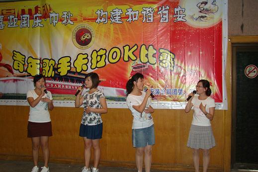 為慶祝新中國(guó)成立60周年暨傳統(tǒng)中秋佳節(jié),推動(dòng)企業(yè)文化建設(shè),9月4日下午,由公司團(tuán)委、工會(huì)共同舉辦的以“喜迎國(guó)慶·中秋 構(gòu)建和諧省安”為主題的青年歌手卡拉OK大賽在公司職工之家隆重舉行。來(lái)自公司機(jī)關(guān)、項(xiàng)目部及各分公司選派的18名選手參加了比賽。集團(tuán)公司機(jī)關(guān)黨委書(shū)記宋曉英、工會(huì)女工委主任胡愛(ài)紅、人力資源部主任胡建英等應(yīng)邀擔(dān)任本次比賽評(píng)委。公司領(lǐng)導(dǎo)及廣大職工踴躍到場(chǎng)觀看、鼓勁。
