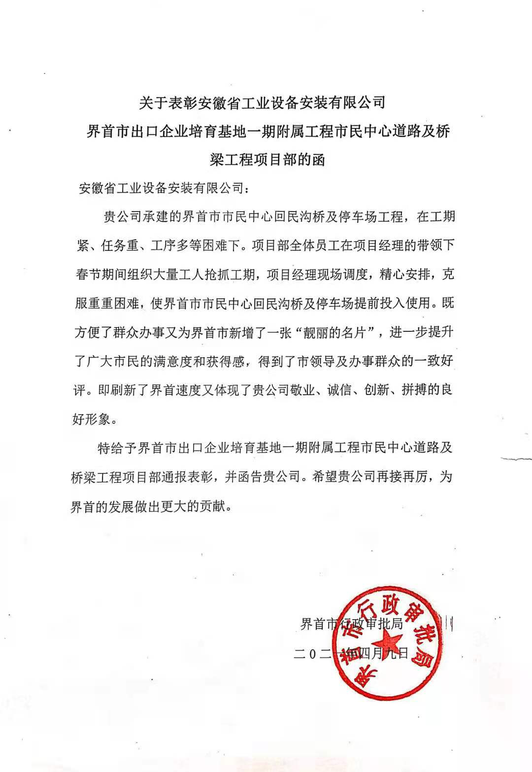 為此,界首市行政審批局發(fā)來表彰函,表彰界首市出口企業(yè)培育基地一期附屬工程市民中心道路及橋梁工程項目部在工程任務中的優(yōu)秀表現(xiàn),相信項目部全體人員會一如既往秉持“團結、拼搏、求實、創(chuàng)新”的企業(yè)精神,繼續(xù)努力,為城市的建設、企業(yè)的發(fā)展作出更大的貢獻!
