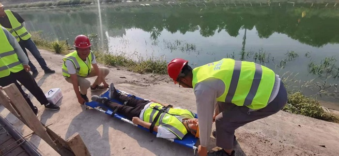 固鎮(zhèn)三八河景觀工程項目部根據(jù)本項目臨近水邊的作業(yè)特點開展了防溺水應急救援演練,模擬現(xiàn)場人員發(fā)生溺水,項目部立即組織人力搶救上岸。立即清除口、鼻中的污泥、雜草,保持呼吸道通暢。并進行胸外按壓及人工呼吸,120救護車及時到場后送往醫(yī)院搶救,通過防溺水演練增強了項目部全體員工遇到緊急情況時的應變能力和實際操作救援處置能力。