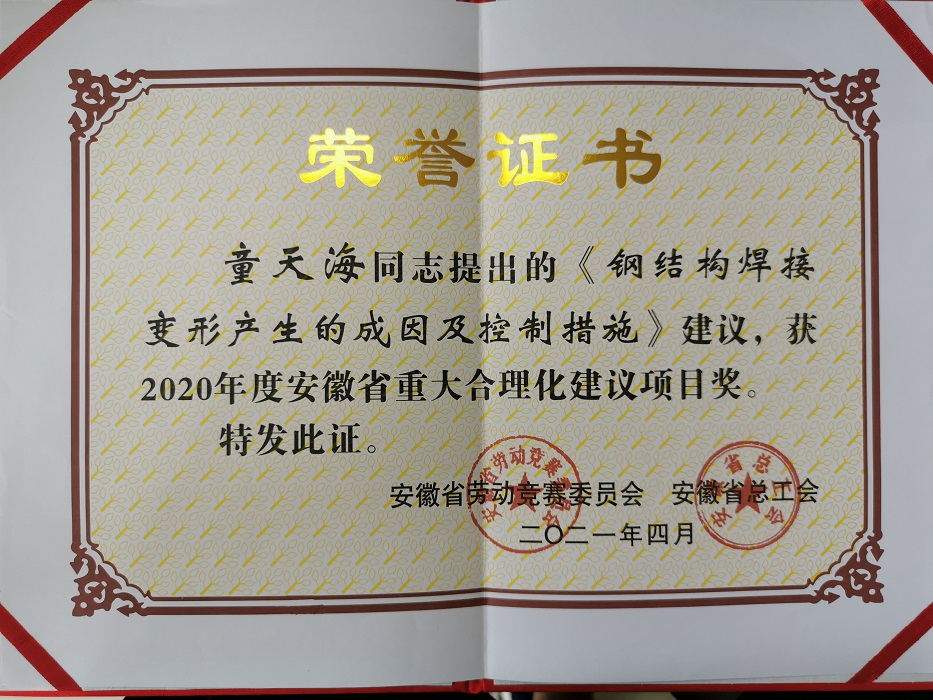 近日,由安徽省勞動競賽委員會和安徽省總工會聯(lián)合評選的“2020年度安徽省重大合理化建議項目獎”揭曉,安徽安裝公司童提出的《鋼結(jié)構(gòu)焊接變形產(chǎn)生的成因及控制措施》成功入選。