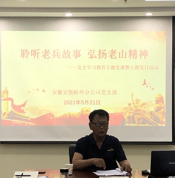 為深入開展黨史學(xué)習(xí)教育活動(dòng),進(jìn)一步引導(dǎo)黨員干部學(xué)習(xí)黨史、銘記黨史,5月21日下午,蚌埠分公司黨支部組織開展了一場(chǎng)“聆聽老兵故事 弘揚(yáng)老山精神”黨史學(xué)習(xí)教育專題黨課暨主題黨日活動(dòng)。邀請(qǐng)?jiān)鴧⒓舆^對(duì)越自衛(wèi)反擊戰(zhàn)的退伍老兵,分公司在職員工年飛同志為大家上了一堂別開生面的黨課。分公司班子成員、項(xiàng)目經(jīng)理、部門負(fù)責(zé)人及全體黨員參會(huì)。