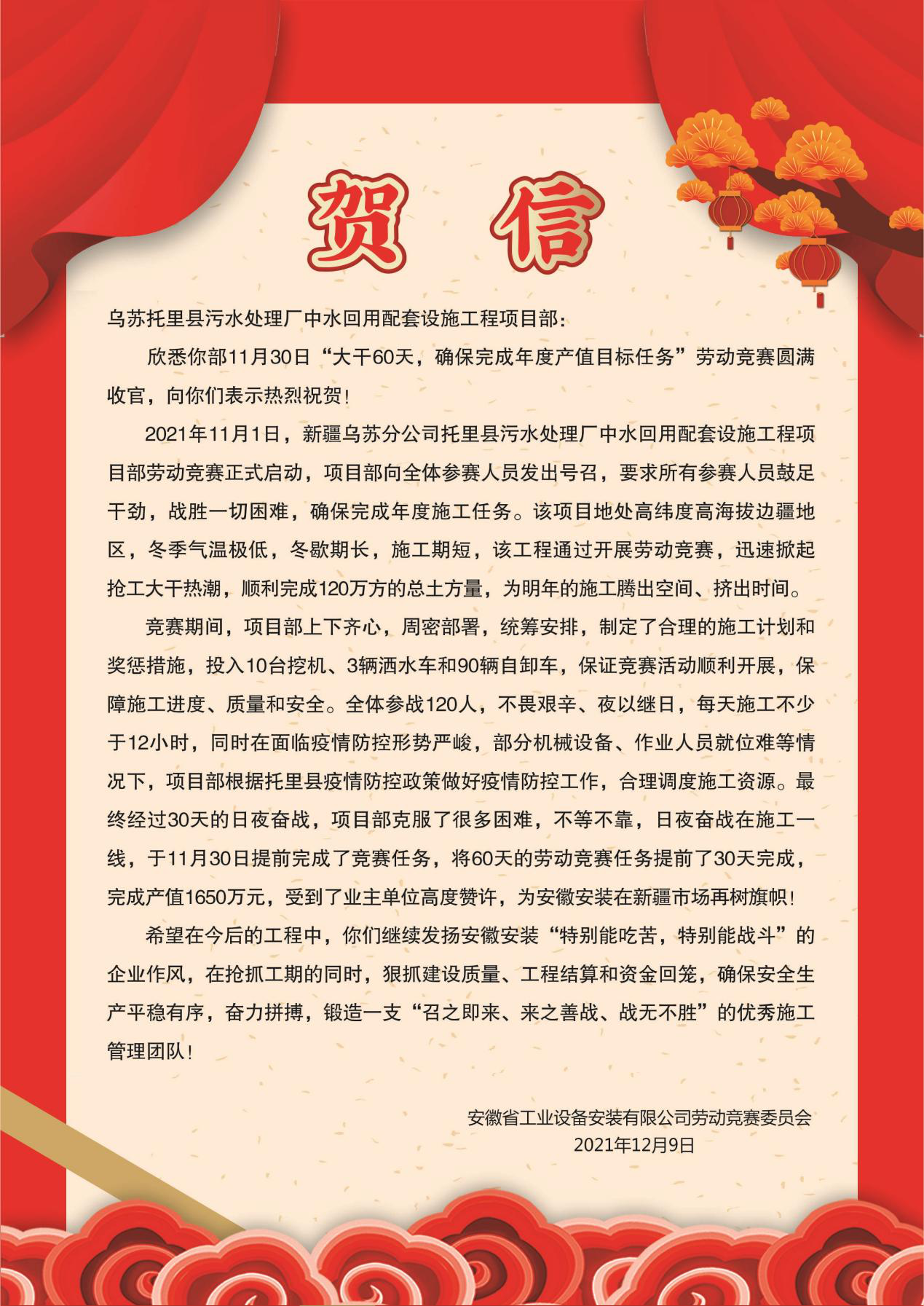 近日,公司勞動競賽委員會向蕪湖鋼構(gòu)智能制造有限公司廠房鋼結(jié)構(gòu)項(xiàng)目部和新疆托里縣污水處理廠中水回用配套設(shè)施工程項(xiàng)目部發(fā)出賀信,祝賀兩項(xiàng)目部勞動競賽圓滿完成!