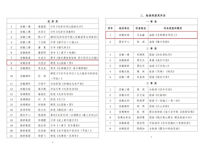 9月29日,集團(tuán)公司工會(huì)通報(bào)了“翰墨寫(xiě)初心 丹青頌黨恩”職工書(shū)畫(huà)攝影作品展評(píng)選結(jié)果,安徽安裝公司選送的五幅作品榜上有名。其中馬金鑫的油畫(huà)作品《支部建在項(xiàng)目上》榮獲繪畫(huà)類一等獎(jiǎng),任禹豪的攝影作品《幸福是干出來(lái)的》榮獲攝影類二等獎(jiǎng),化范寶的硬筆書(shū)法作品《沁園春·雪》和程茂麗的攝影作品《攀登》、胡欣欣的攝影作品《齊心》分別榮獲書(shū)法類優(yōu)秀獎(jiǎng)和攝影類優(yōu)秀獎(jiǎng)。