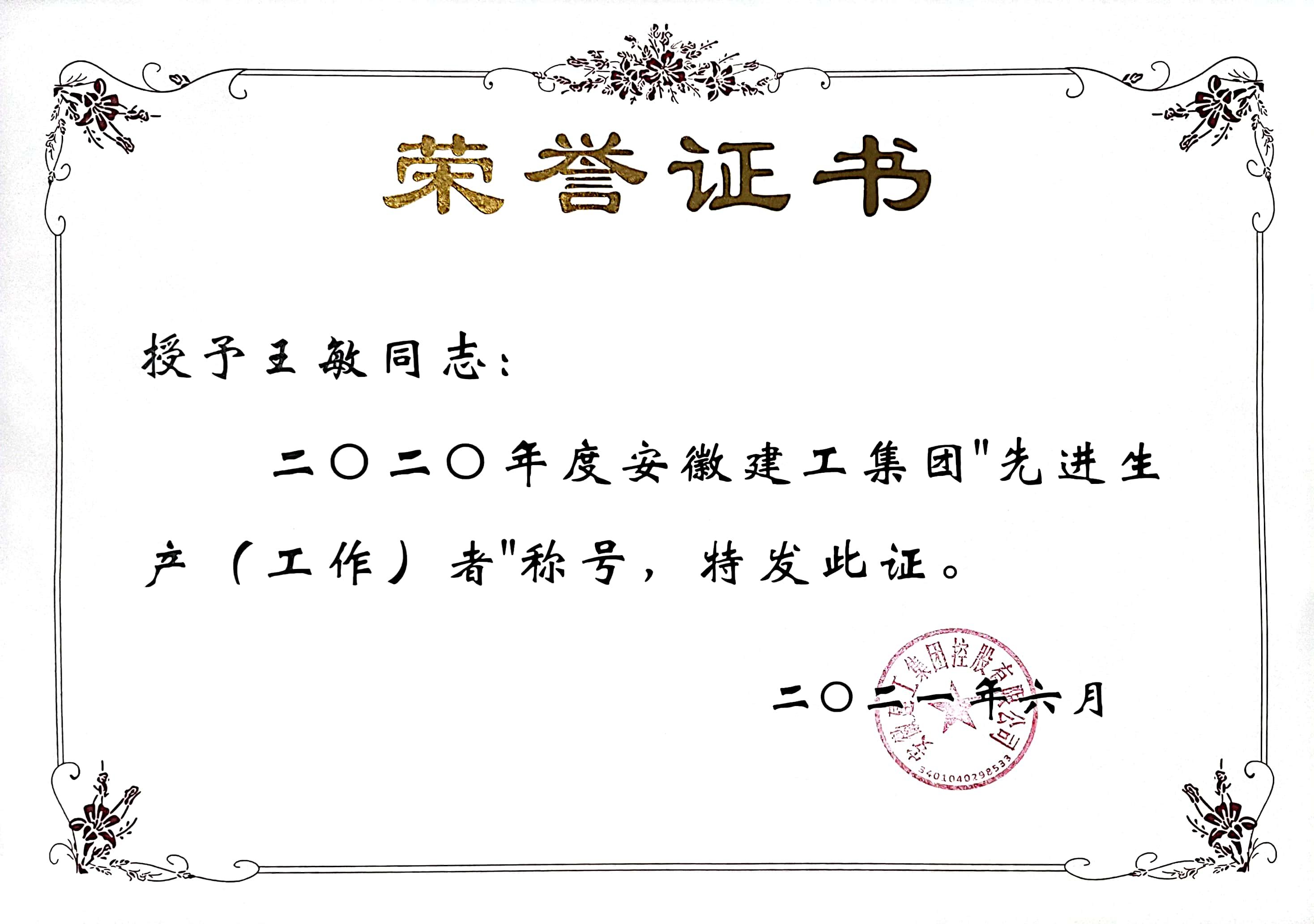 在工作作風(fēng)上,王敏一貫堅(jiān)持對自己高標(biāo)準(zhǔn)嚴(yán)要求,腳踏實(shí)地,勤奮敬業(yè),認(rèn)真細(xì)致,勤于思考,盡心盡責(zé),主動、積極地做好每一項(xiàng)工作,認(rèn)真履行崗位職責(zé)。她時常告誡自己要以德服人,以身作則,并在實(shí)際工作中努力實(shí)踐著這一思想 ,注重自己的一言一行,公正、客觀,一切從大局出發(fā),不謀私利,不圖己便,廉潔自律,做到自重、自省、自警和自勵。2021年,王敏由于出色的工作成績,被評為“安徽建工集團(tuán)2020年度先進(jìn)生產(chǎn)(工作)者”,她說,這是集團(tuán)對她過去工作的肯定,也是對她未來工作的要求。