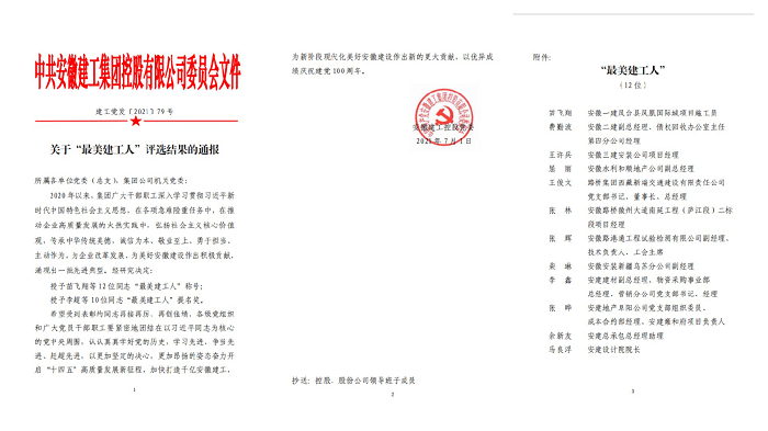 7月1日至7月2日,安徽建工集團(tuán)控股有限公司二屆一次職工代表大會(huì)暨“七一”表彰會(huì)在合肥召開(kāi)。會(huì)上表彰了12名“最美建工人”榮譽(yù)稱號(hào)獲得者,安徽安裝公司柴琳獲此殊榮。