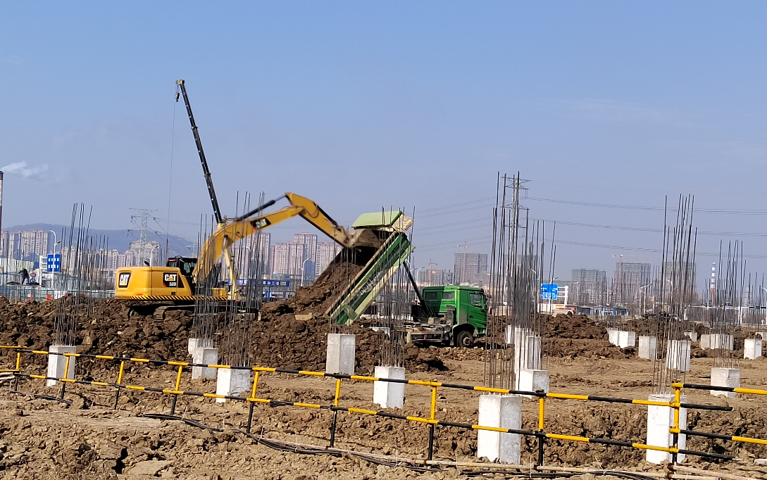 現(xiàn)場(chǎng)隨處可見(jiàn)的挖掘機(jī)、裝載車(chē)、吊車(chē)的轟鳴聲與工人師傅們緊張忙碌的工作場(chǎng)景交織在一起,勾勒出一派繁忙、壯觀、熱火朝天的節(jié)日大干火熱場(chǎng)景。