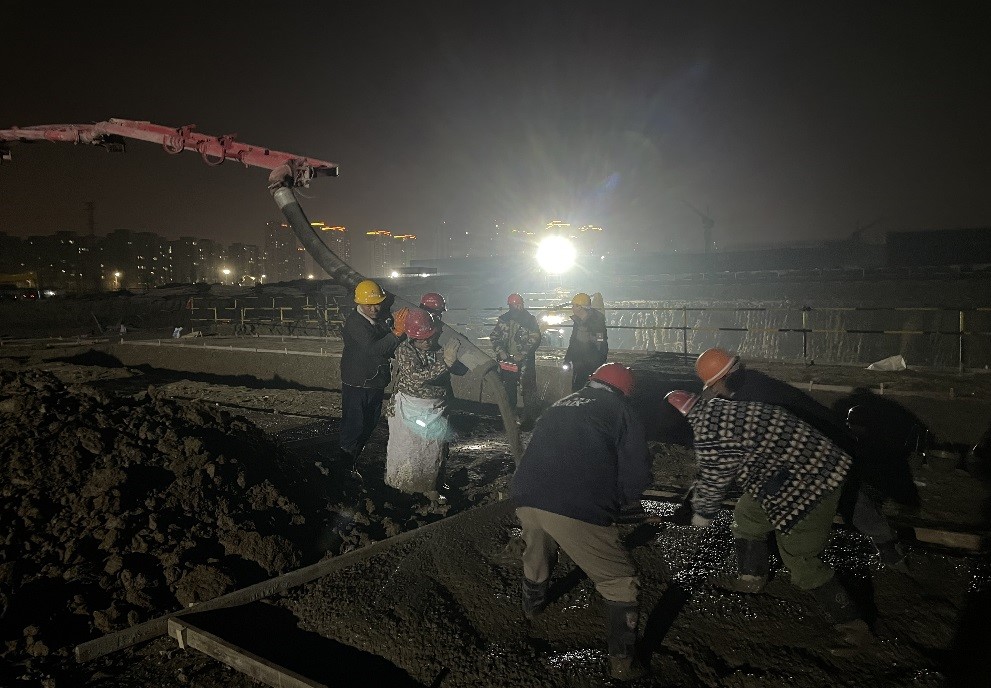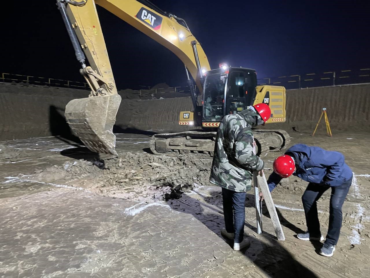 為滿(mǎn)足西動(dòng)力中心承臺(tái)澆筑要求,施工現(xiàn)場(chǎng)燈火通明,項(xiàng)目經(jīng)理徐明東帶領(lǐng)施工員正在認(rèn)真進(jìn)行西動(dòng)力中心承臺(tái)基礎(chǔ)測(cè)量復(fù)核工作。