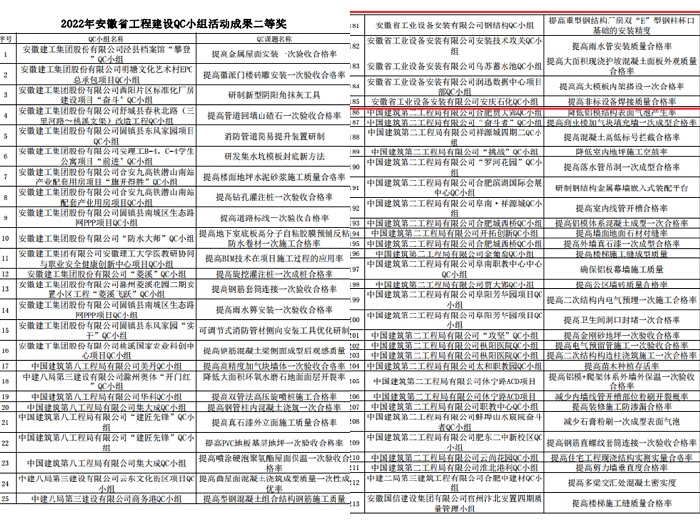 其中安徽安裝公司阜陽市潁東區(qū)中醫(yī)院QC活動小組完成的《提高通風空調(diào)風管系統(tǒng)嚴密性合格率》榮獲2022年安徽省工程建設QC小組活動成果一等獎。安徽安裝公司安徽省安暖通QC攻關小組完成的《提高不銹鋼空調(diào)供回水管質(zhì)量合格率》、鋼結構QC小組完成的《提高重型鋼結構廠房雙“H”型鋼柱杯口基礎的安裝精度》等六項課題榮獲2022年安徽省工程建設QC小組活動成果二等獎。安徽安裝公司公司邊坡鉆孔QC小組完成的《提高碎礫石地層邊坡網(wǎng)施工一次鉆孔的成孔率》、安慶石化項目技術攻關QC小組完成的《提升設備基礎二次灌漿質(zhì)量》等四項課題榮獲2022年安徽省工程建設QC小組活動成果三等獎。