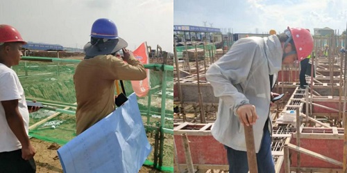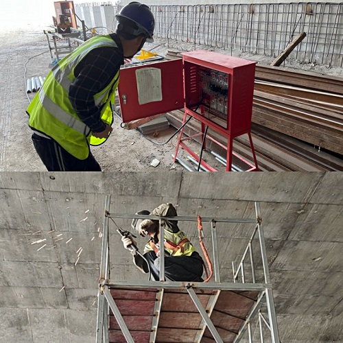 圖為花園大道道路工程項(xiàng)目現(xiàn)場臨時(shí)用電檢查及登高架焊接場景