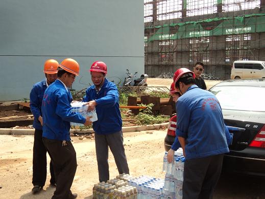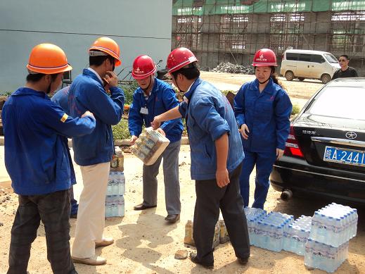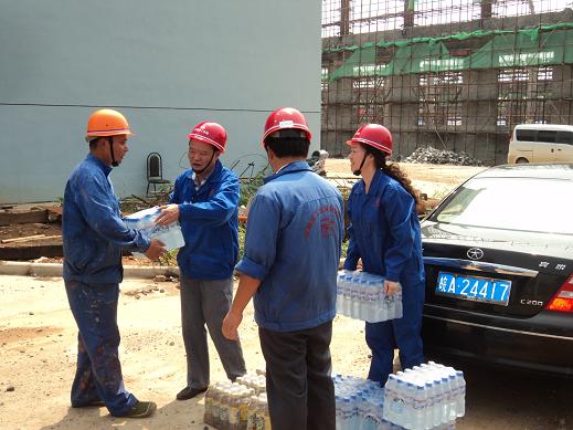 7月28日,氣溫高達(dá)36度,酷暑難耐,分公司書(shū)記、經(jīng)理李貴林,副經(jīng)理史崇松、方斌、劉紅艷一行深入一線(xiàn)工地,慰問(wèn)戰(zhàn)斗在一線(xiàn)的生產(chǎn)、管理人員。每到一處,李貴林同志都會(huì)關(guān)切的詢(xún)問(wèn)防暑和安全情況,并將一箱箱礦泉水送到一線(xiàn)人員的手中,使他們?cè)谙娜绽锔惺艿搅艘豢|清爽的涼風(fēng)。