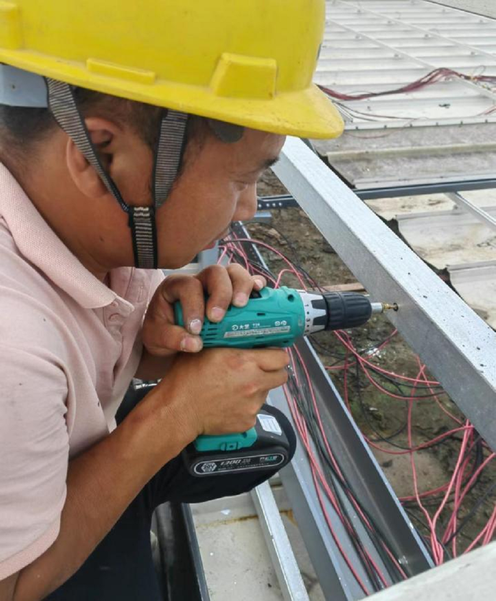 圖為工人使用電動(dòng)螺絲刀安裝逆變器支架