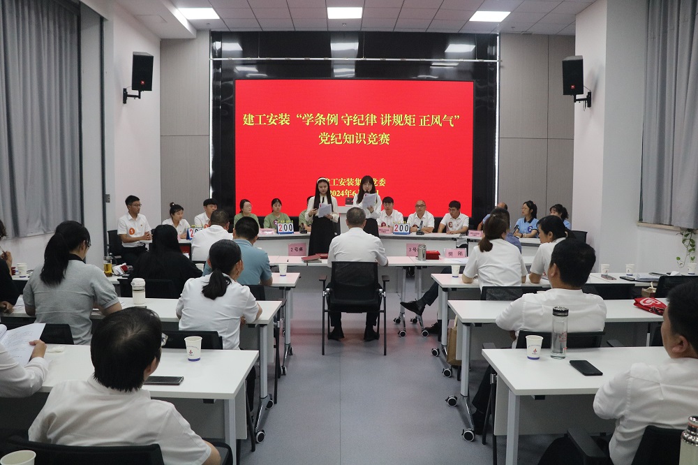 6月27日下午,建工安裝集團舉辦“學條例 守紀律 講規(guī)矩 正風氣”黨紀知識競賽。公司黨委委員、紀委書記李楊,黨委委員、副總經(jīng)理董雙武,黨委委員、副總經(jīng)理樊剛出席活動,各黨支部書記、機關部門負責人以及參賽選手等40余人參加活動。