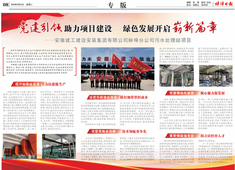 媒體專版報道了建工安裝蚌埠分公司高新區(qū)電子信息產(chǎn)業(yè)園EPC項目污水處理站機電安裝工程項目的基本概況,以及該項目抓黨建、保生產(chǎn)、降成本、強技術、育人才等方面的成功經(jīng)驗和做法。