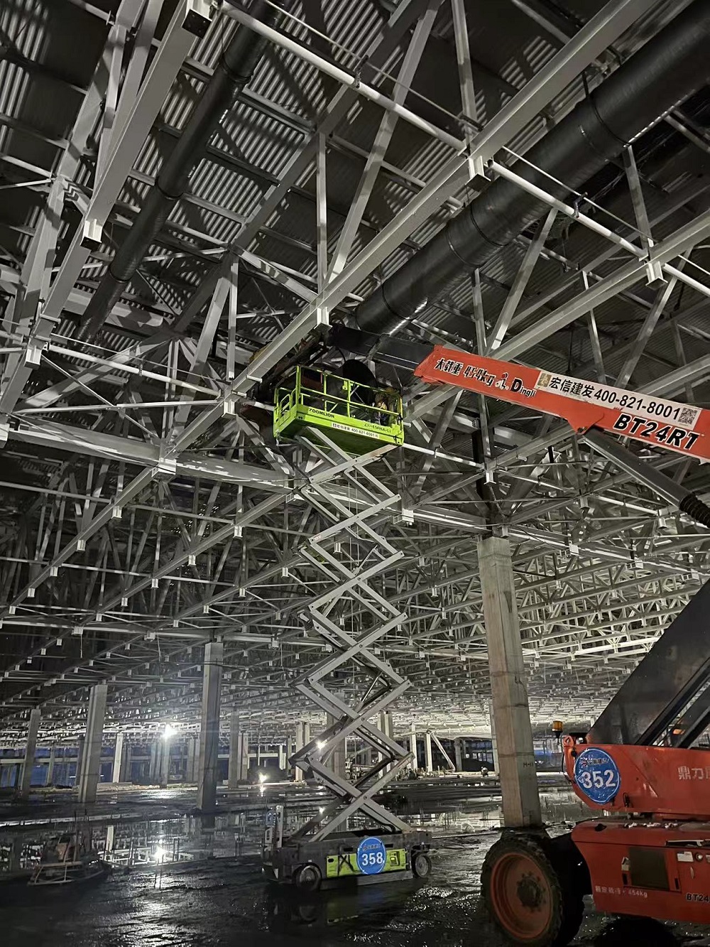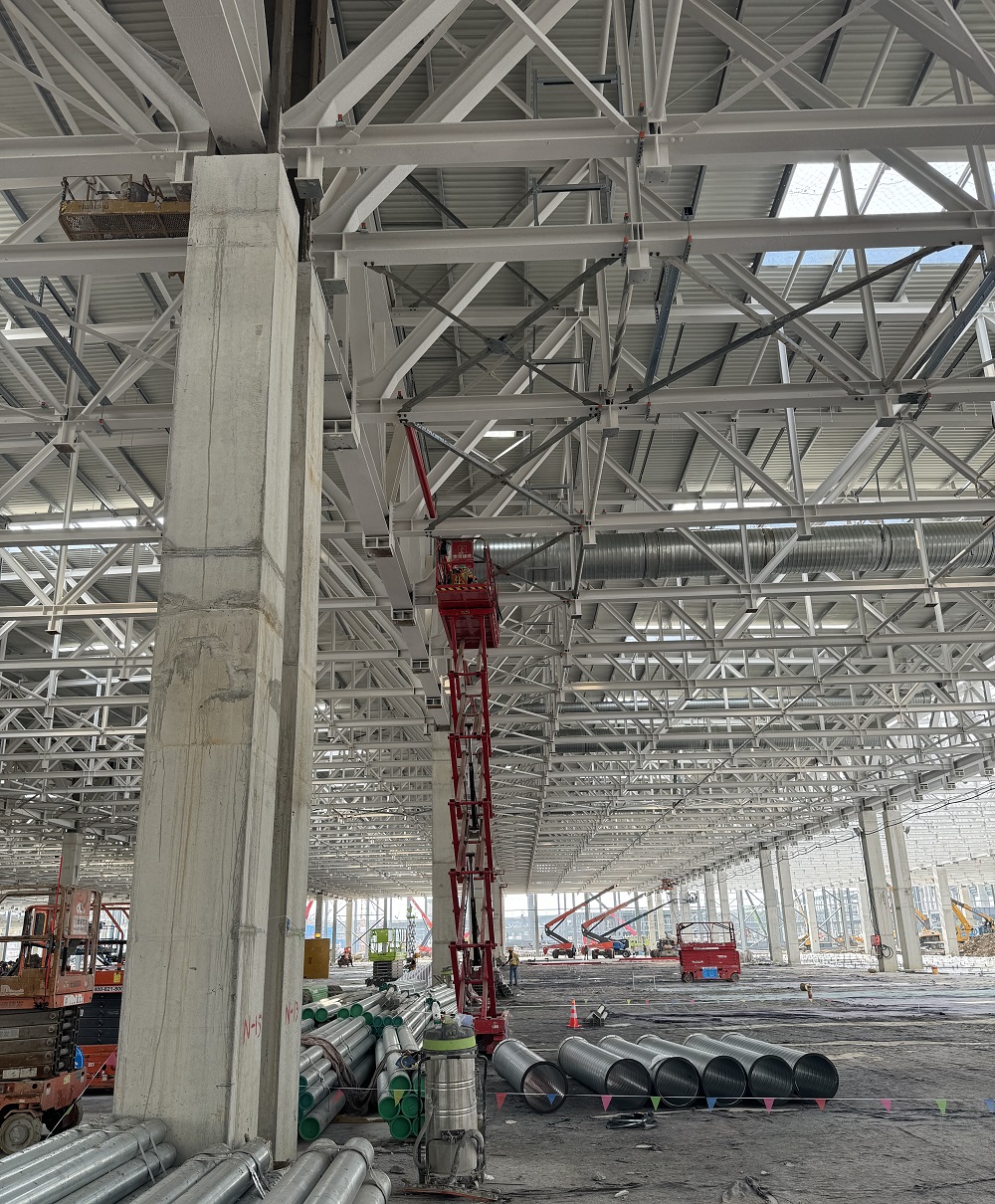 目前正在進行車間一1-6區(qū)通風管、照明管、橋架、虹吸雨水管、衛(wèi)生間排水管、防雷接地、消防管等安裝作業(yè),材料加工區(qū)預制各類管道支架也在同步推進。現已完成車間一風管安裝約3000平方米,風管預制約8000平方米,虹吸雨水管道安裝約120米,照明配管安裝約2000米,消防管道安裝約320米,防雷接地網安裝約10000米,橋架安裝約400米。