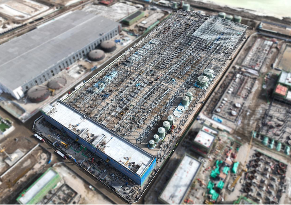 截至目前變電所主體結構封頂,二次結構完成一半;廠房鋼結構主體基本完成,圍護系統(tǒng)進場施工,設備基礎全部完成。