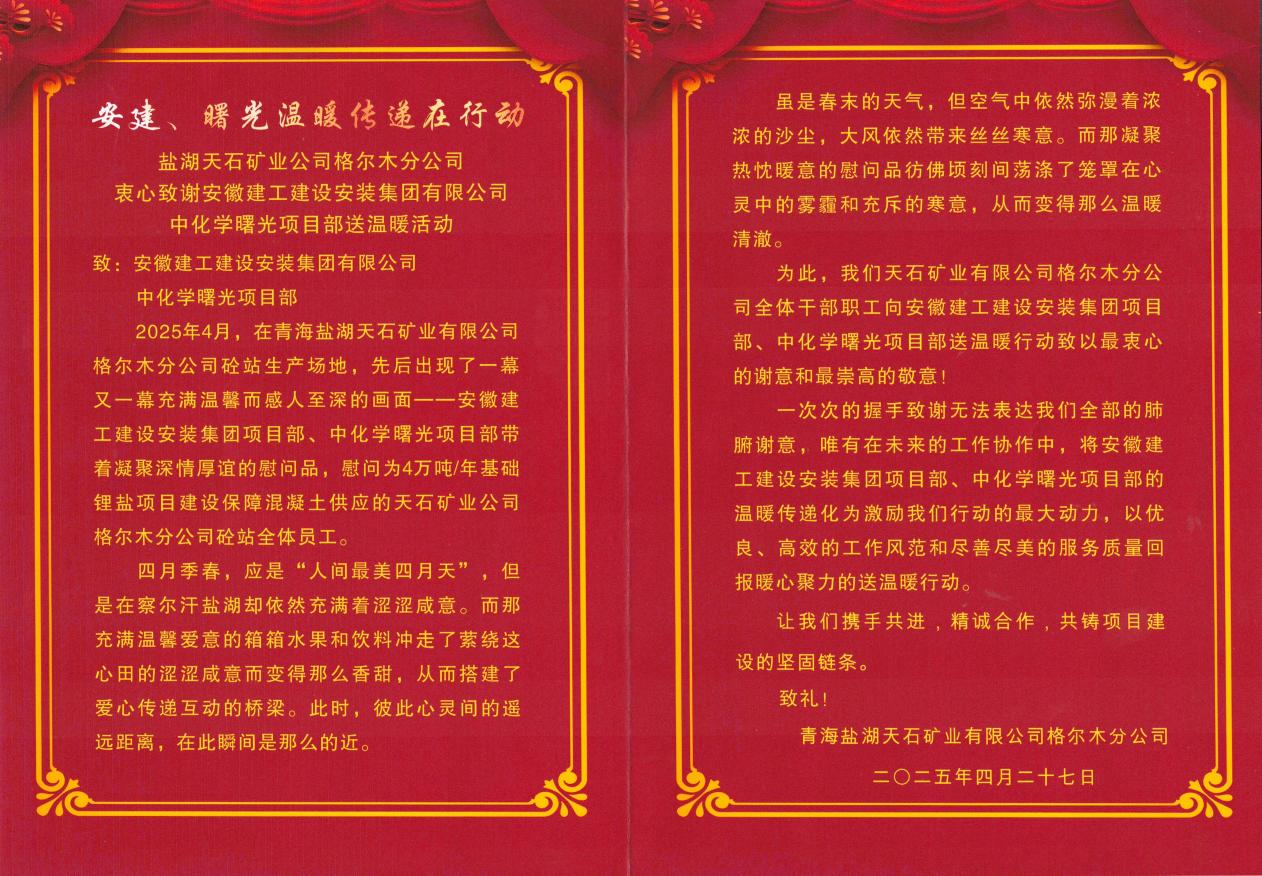 信中,青海鹽湖天石礦業(yè)有限公司格爾木分公司對建工安裝項目部此前慰問砼站全體員工致以最誠摯的感謝,愿繼續(xù)與建工安裝項目部攜手共進、精誠合作、再創(chuàng)佳績!這封感謝信不僅是對項目部過往成績的肯定,更是一份振奮人心的激勵。建工安裝將繼續(xù)保持高昂斗志和嚴謹態(tài)度,加強與相關單位溝通協(xié)作,強化項目管理,確保項目按期、高質量交付,為打造世界級鹽湖提鋰產業(yè)基地貢獻力量!