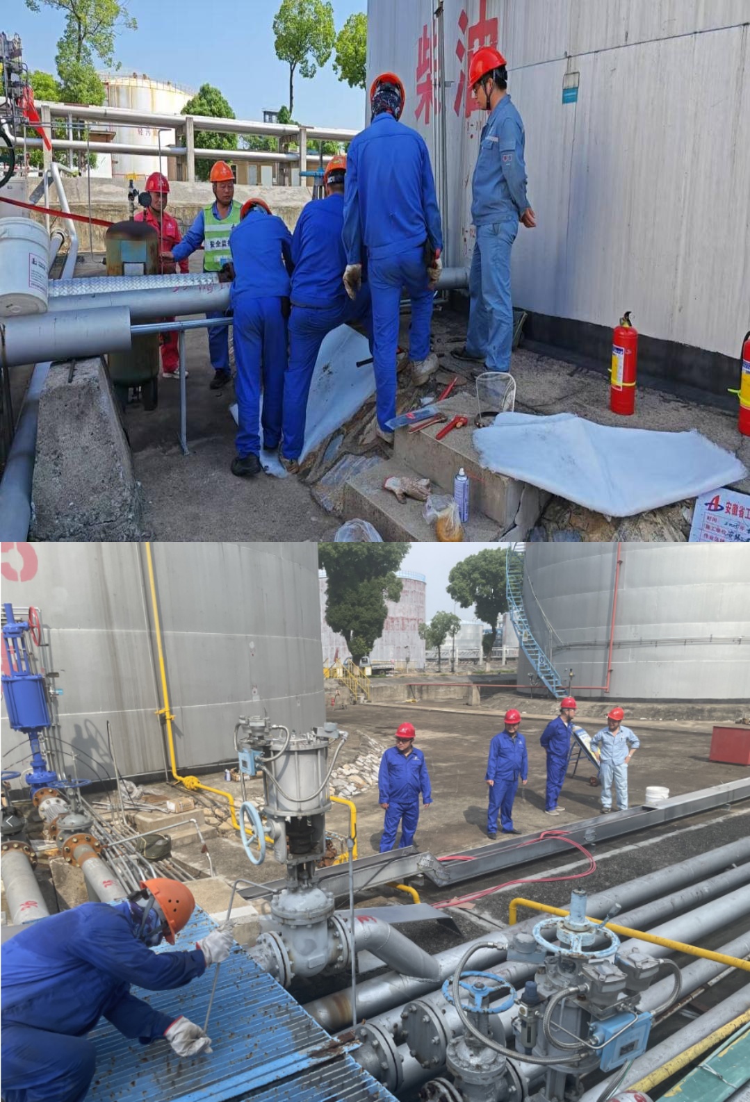 在培訓演練的同時,隱患排查工作也在同步扎實推進。市政公司聯(lián)合安慶石化儲運部、設備工程部及青島安工院,對框架協(xié)議項目進行現場專業(yè)指導聯(lián)合檢查。針對檢查出的安全隱患,及時下發(fā)整改通知單,各班組迅速響應、逐項整改并反饋,形成了隱患排查治理的閉環(huán)管理。隨后,市政公司黨支部充分發(fā)揮黨建引領作用,支委班子深入儲運部五、七等罐區(qū)進出口管線增設緊急切斷閥門等項目一線,與儲運部作業(yè)區(qū)領導圍繞項目安全管理深入研討,并實地檢查施工進度與安全防護措施落實情況,將黨建工作與安全生產深度融合,全力保障項目安全有序推進。